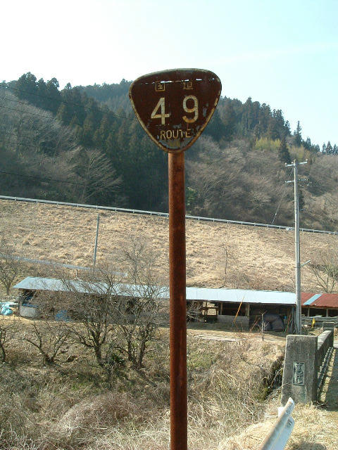 [R-49-2] いわき市 旧R49長沢峠に2つある標識の うち郡山側から見て右側の物 です。左側の物は現在は支柱 のみとなっています。 |