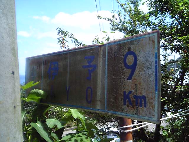 表面は錆び錆びです。 文字はなんとか読めますね、電柱に立ち塞がられながらも ただ、ひたすらに、健気に「↑伊予 9Km」。 微笑ましいじゃありませんか。 海沿いという立地条件としては厳しい環境で よくぞ残っていた!感動した! |