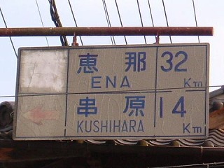 独特のフォントで書かれてます。 妙に距離表記がずれた位置に書かれているのは 気のせいでしょうか?? 恵那方面への矢印は元々真っ直ぐだったようです。 やん・たーきーさんによれば 「真っ直ぐ行くより左折で現道に出たほうが早い」 からではないか?とのことでした。 矢印書き直せばいいのに・・・(-。-)ボソッ ※2005年年末、撤去確認されたそうです。 ウーン、残念。。。 |
