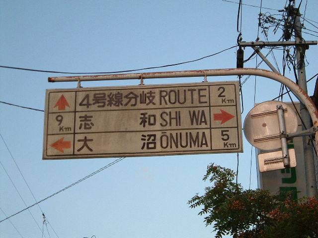 寂れた雰囲気の味のある白看です。 最上段、普通は 「↑国道4号線 ROUTE4」 とでも書かれそうなもんですが、 4号線分岐ときました、しかも単にROUTEだけ。 さらに「志和」は現在は見られない地名ですが、 現在の紫波町の前身として「志和村」が 昭和30年まで存在していたようです。 と、いうことはこの白看、昭和30年以前の設置?? もしくは合併後、まだ「志和」の地名が色濃かった 頃とも考えられますね。 さらにさらに「大沼」はどうやら盛岡市の小字のようで なぜそんなピンポイントな地名を入れたのか?? 色々と面白い標識でした(´ー`) |