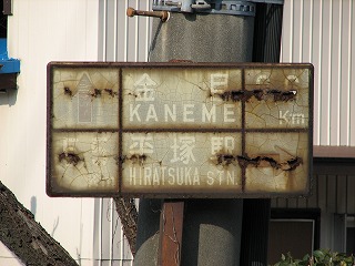 錆々の角柱に支えられながら 異様な妖気を発している白看が・・・! 上段下段ともに横に錆が入って 肝心なところに穴が開いています。 文字も完全に反転していますし、既に標識としての 存在意義は限りなく0%に近そうな マニア向け白看ですね。凄い! 特に「平塚駅 HIRATSUKA STN.」の雰囲気が 素晴らしい・・・ もちろん”平”が旧字なところも。 |