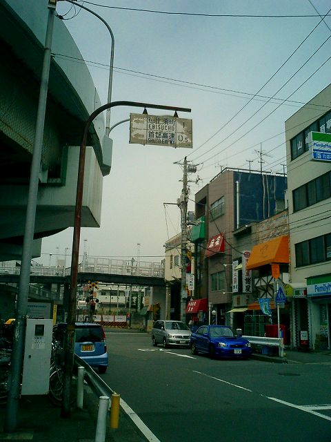 近代的なループ式の陸橋の脇に 真っ赤に錆びた支柱に吊るされています。 支柱と白看を繋ぐ金具も古いものによくある 形ですね。(▲っぽいヤツです) |