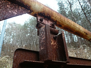そして問題の支柱との連結部分。 見事に兆番状のものでくっついています。 しかも、激しく錆付きながらも動かしてみると まだ可動性があるじゃないですか! そもそもなぜ可動式なのか・・・意味不明。 |