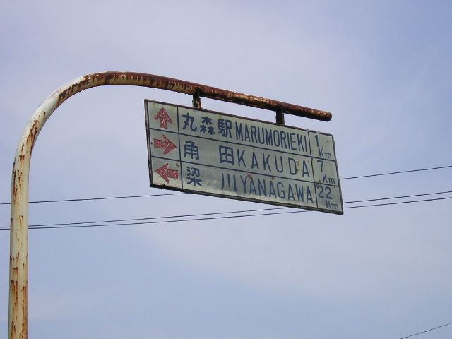 珍しいAタイプです。 さらに「丸森駅」のローマ字表記が 通常「MARUMORI STN.」などと 書かれるところがこの標識では 「MARUMORIEKI」 とそのまま書かれていて非常に 珍しいです。 |