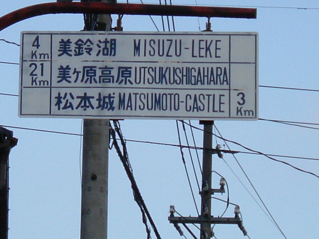 これも朝の・・・(以下同) さきほどのもそうですが、矢印の色が飛んでしまって 行き先が分かりません。 方面・方向及び距離のウチ「方面」と「方向」が 分からないとなるとどうなんでしょう?(笑) さらに「美ヶ原高原」の「高原」が訳されて いませんが・・・ おまけに美鈴湖が「MISUZU-LEKE」 もろにスペルミスってますよ、松本市さん(^_^; (じゃなくて当時は本郷村でしょうか) |