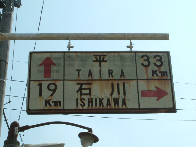 白看の状態はまずまずですね。 表記は「↑平 33km」「→石川 19km」 となっています。 平市は現在はいわき市となっています。 ※いわき市※ 昭和41年に平市を中心とした5市4町5村 が合併し成立した市で日本一面積の 大きな市です。 |