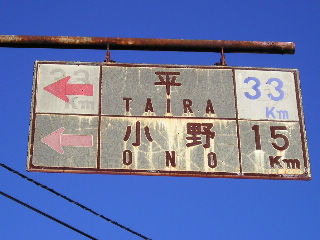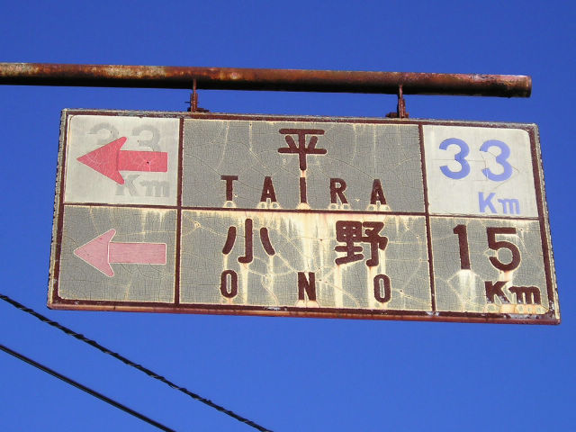 白看は既出の2つと同じ位の状態ですね。 「平」の行き先が右から左へ修正されているのは 交差する道路(旧R49)の変遷をそのまま示しています。 (平は写真右方向ですが、ここでは新道に誘導するように 方向が表示してある。ちなみに「平」はいわき市の地名です。 白看設置当時は「平市」でした。) それにしても方向だけ修正しても33Kmという距離表示は 直されていないところが急ごしらえと言う感じで良いです。 どう考えても新道経由だと33Km+数Km増えますから・・・ |