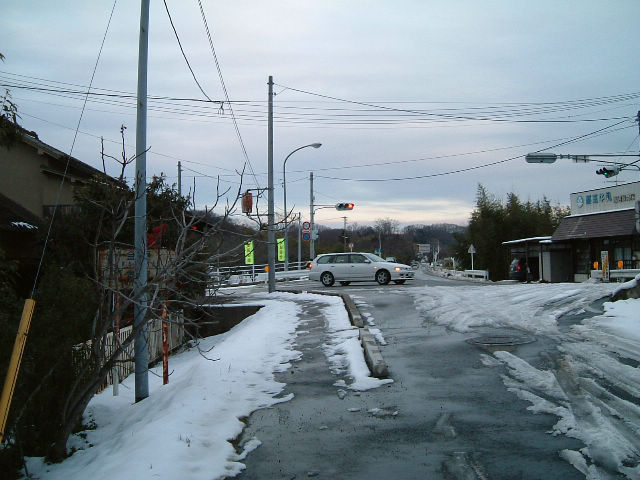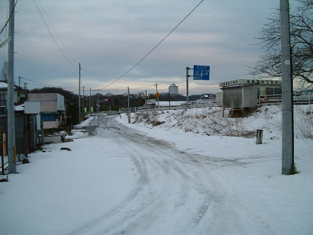 TUKAさんより情報を頂きました。 これにて「方面・方向及び距離B」50本達成です! そしてそんな記念すべき50本目が わが街、郡山で・・・!しかも初白看! 2005年正月、意気揚々と早速現地へ。 ここは旧R288とR288の合流点を 遠望したところで、 奥に見える信号のところが合流点です。 問題の白看はというと・・・ |