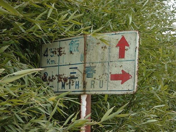 草木に埋もれていた分、色あせも錆も少なく、 青色が比較的キレイです。 植物が被っていない標識右側は 色あせがありますが、なぜか矢印だけ はっきりとしている気がしますね・・・ 矢印の形も少しいびつですし 後から塗りなおされた可能性大ですね(^^; |