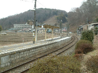 ![]() 駅ホーム、船引方面です。 船引は東のほうですが、電車はいったん 北へ向かった後、ヘアピンでトンネルをくぐり 東へ向かっていきます。 左奥に見える建物は要田中学校です。 |