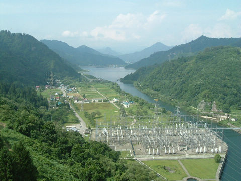 田子倉ダム上からの田子倉発電所、只見ダムの眺め。