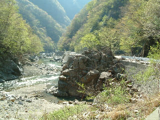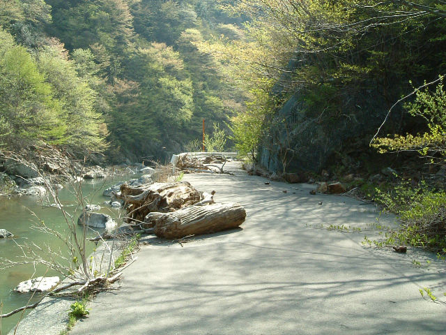 深いV字に切れ込んだ谷底の渓流脇を